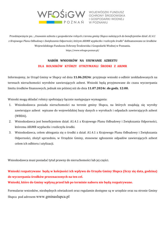 Informujemy, że Urząd Gminy w Słupcy od dnia 11.06.2024r. przyjmuje wnioski o odbiór zeskładowanych na terenach nieruchomości wyrobów zawierających azbest. Wnioski będą przyjmowane do czasu wyczerpania limitu środków finansowych, jednak nie później niż do dnia 11.07.2024r. do godz. 12:00.