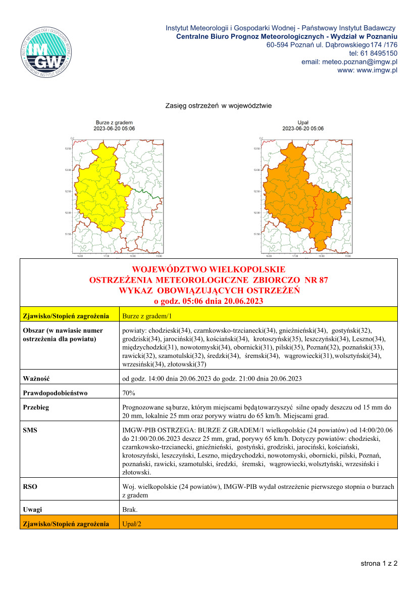 SMS IMGW-PIB OSTRZEGA: BURZE Z GRADEM/1 wielkopolskie (24 powiatów) od 14:00/20.06
